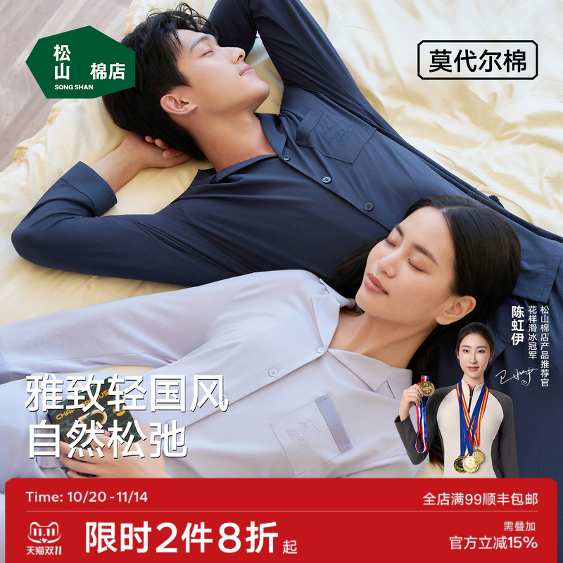 松山棉店家居服套装莫代尔情侣新中式长袖男女大码国风春秋款睡衣