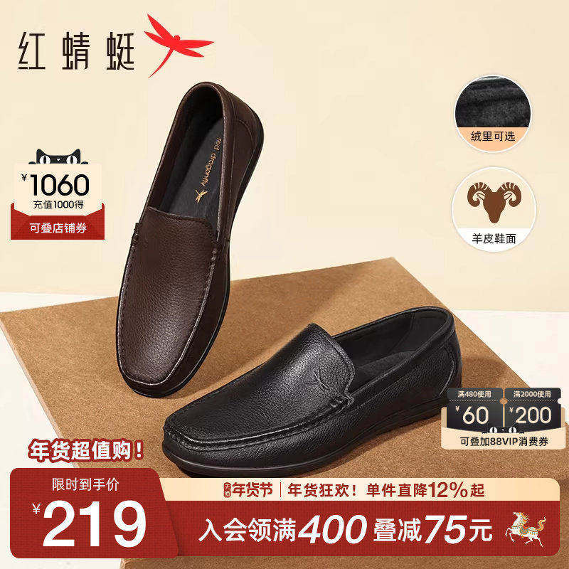 红蜻蜓男士皮鞋新款一脚蹬男鞋商务休闲豆豆乐福鞋软底真皮爸爸鞋