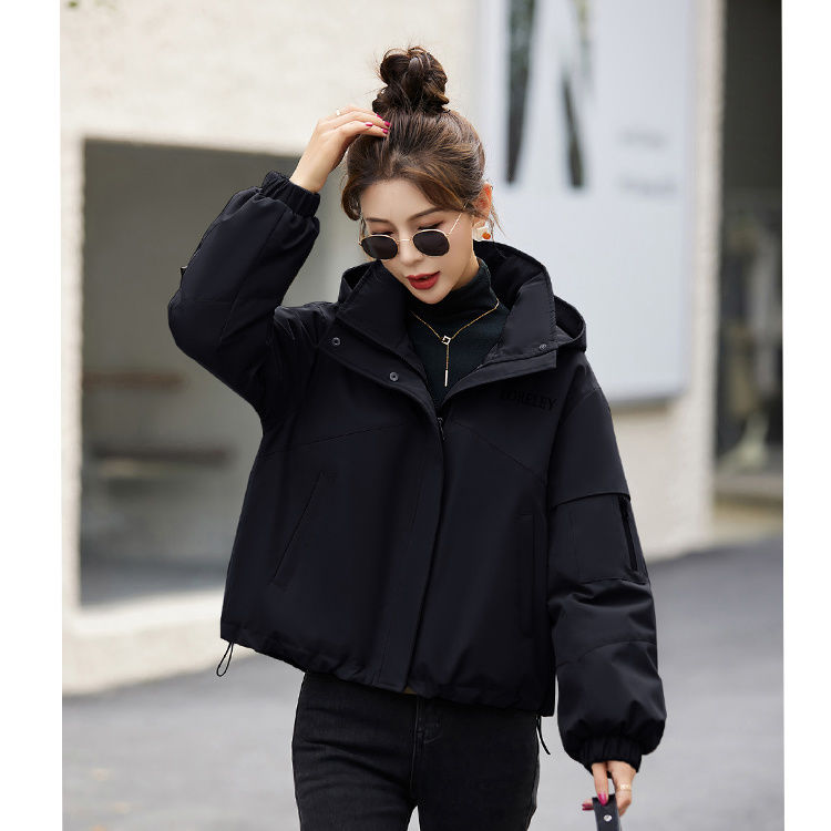欧货连帽工装冲锋衣女冬季加棉加厚拼色刺绣印花棉衣外套宽松风衣