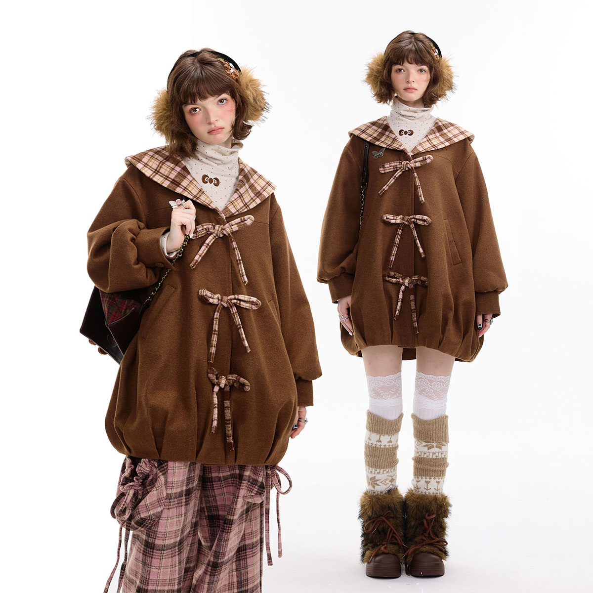 化学少女「蝴蝶迷宫」彩色撞色格纹蝴蝶结毛呢大衣女秋冬复古外套