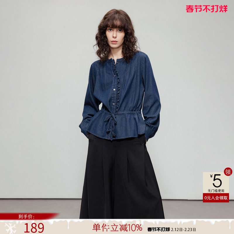 设计师款佐丹奴女装春季新款荷叶边宽松翻领长袖牛仔衬衫18345222