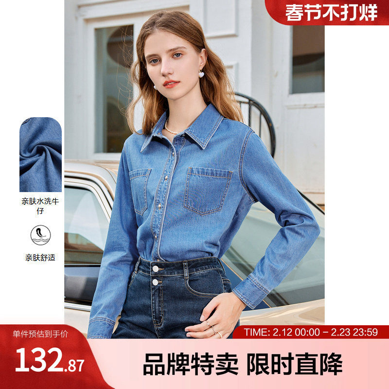佐丹奴牛仔衬衫女新款复古风纯棉洗水单口袋长袖牛仔衬衣13345862