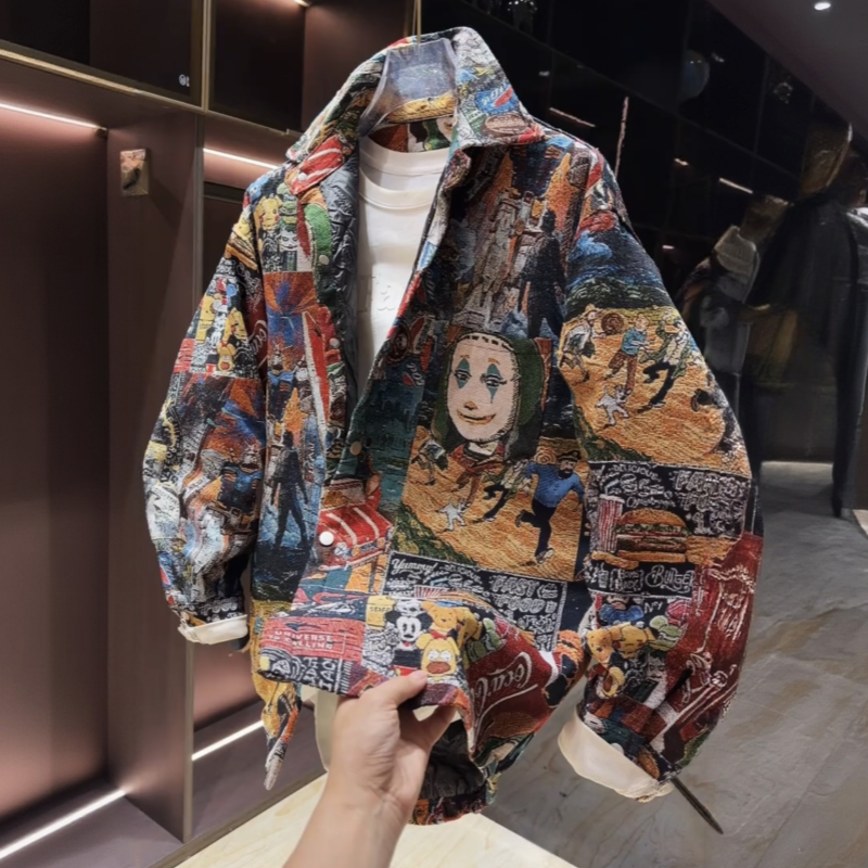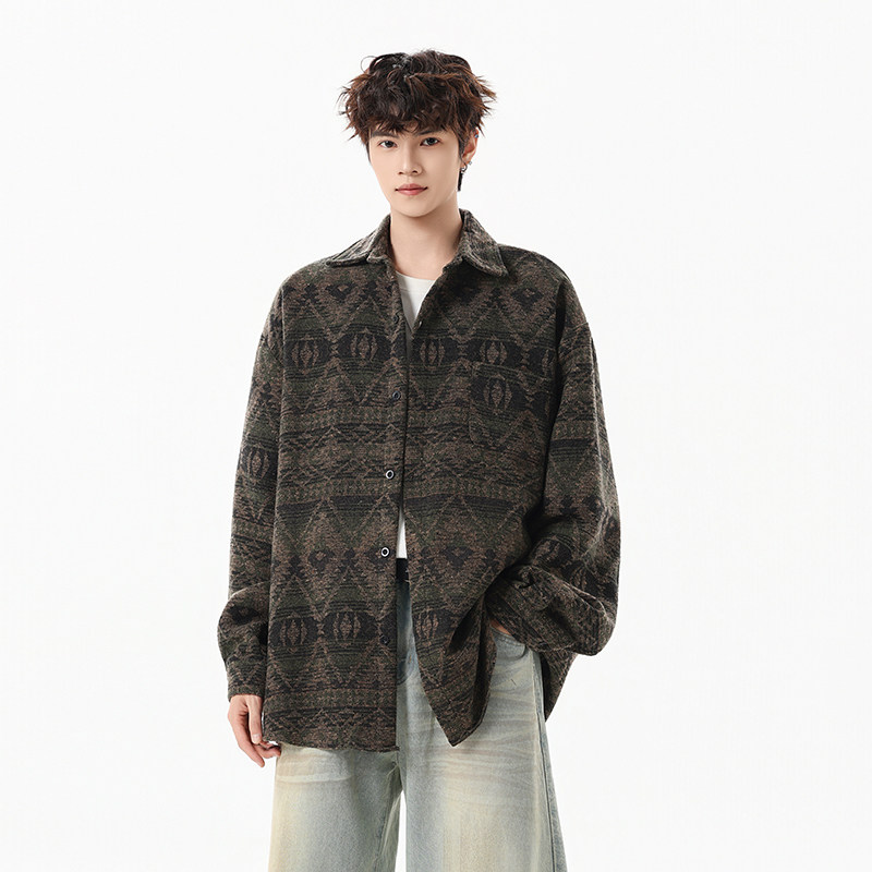 民族风提花复古粗呢夹克男生秋冬开衫高级感针织外套宽松叠穿衬衫
