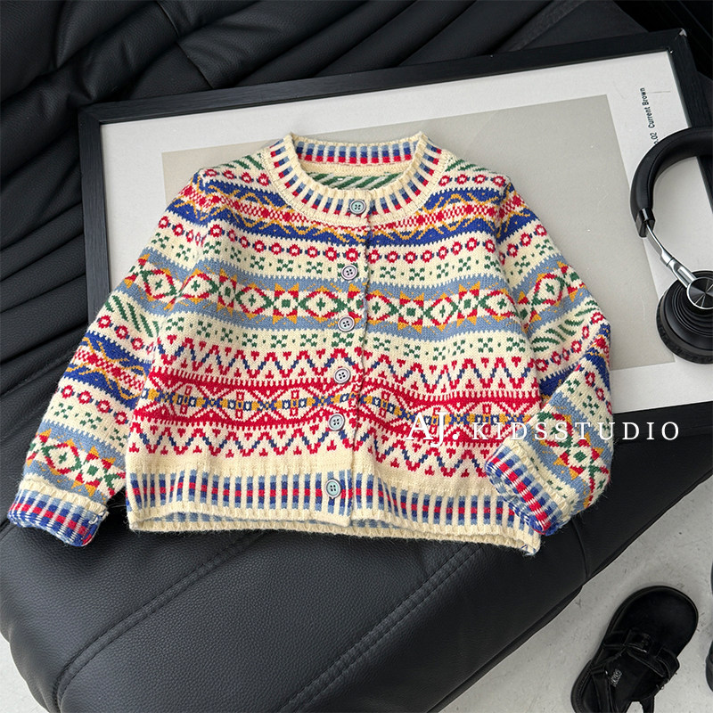 女童民族风撞色花纹针织开衫2025秋冬儿童洋气复古时髦毛衣外套潮