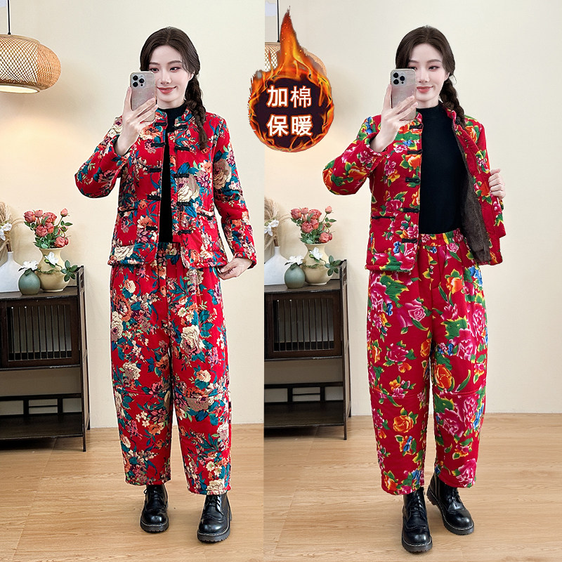 东北大花棉袄民族风加绒加厚棉衣棉裤套装秋冬季小棉袄外套两件套