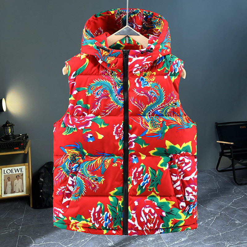 中国民族风东北大花棉马甲男秋冬连帽潮流加厚保暖棉背心坎肩外套