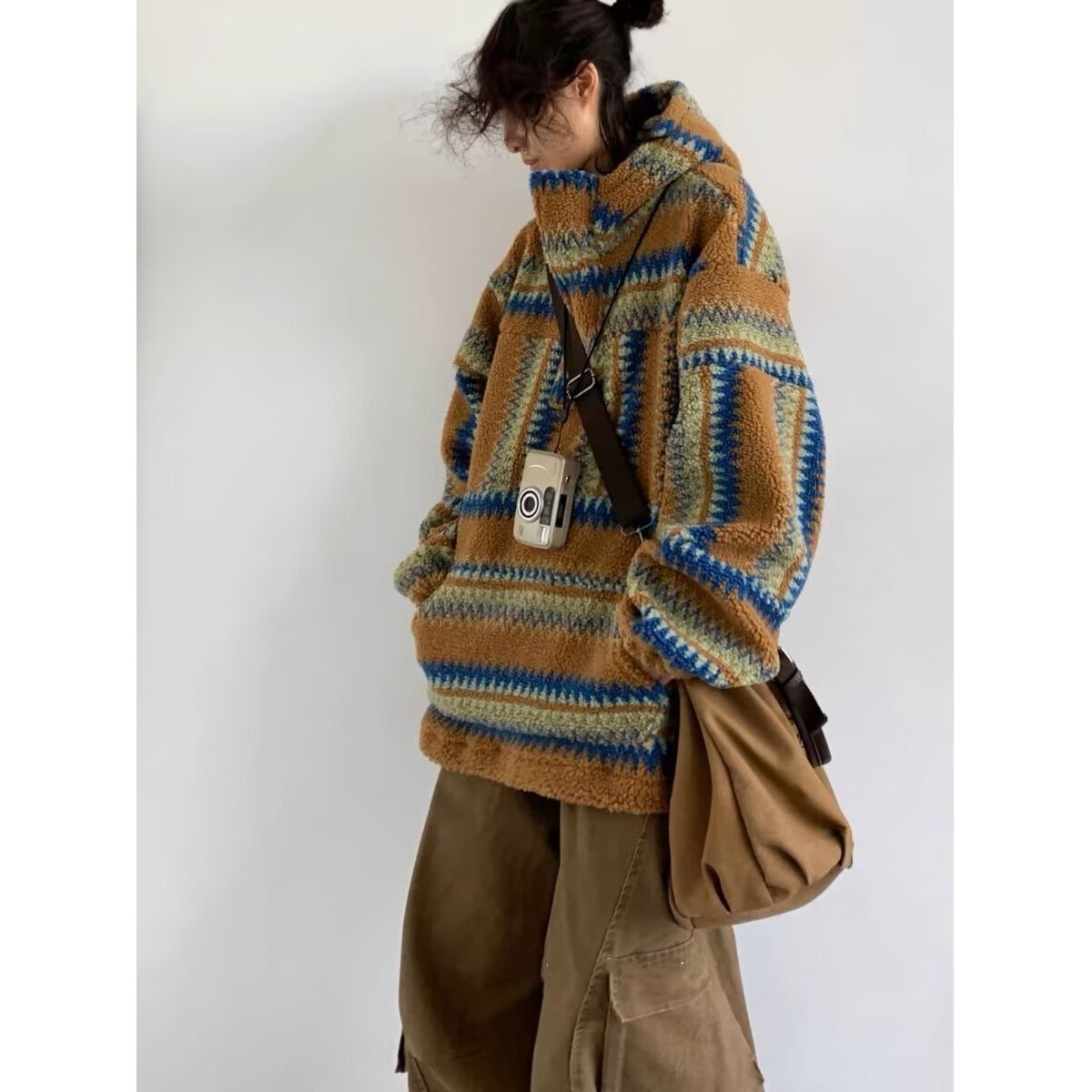 秋冬日系复古民族风羊羔绒连帽卫衣男女款高领半拉链保暖带帽外套