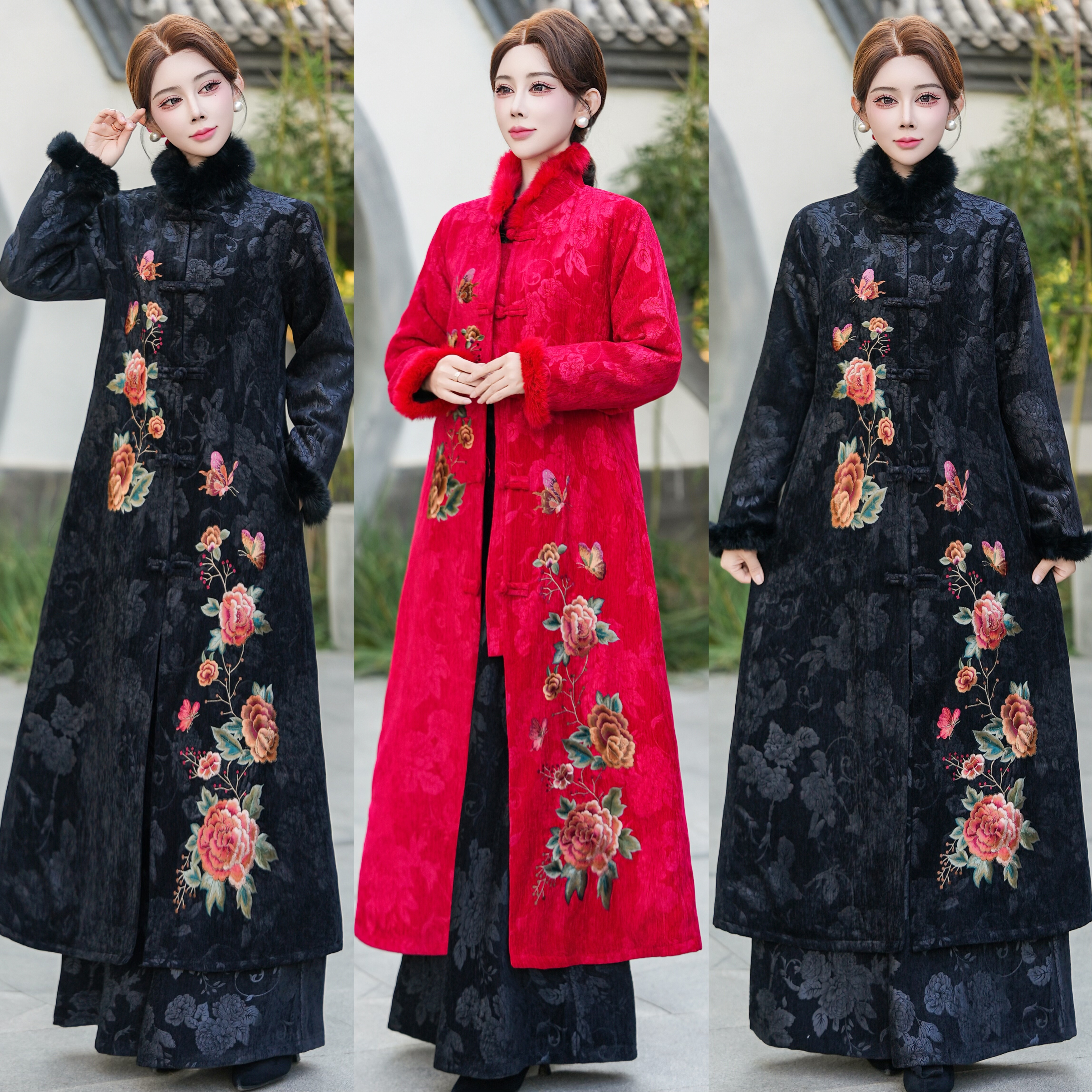 2024秋冬新款新中式民族风雪尼尔刺绣花加厚大码棉大衣唐装外套