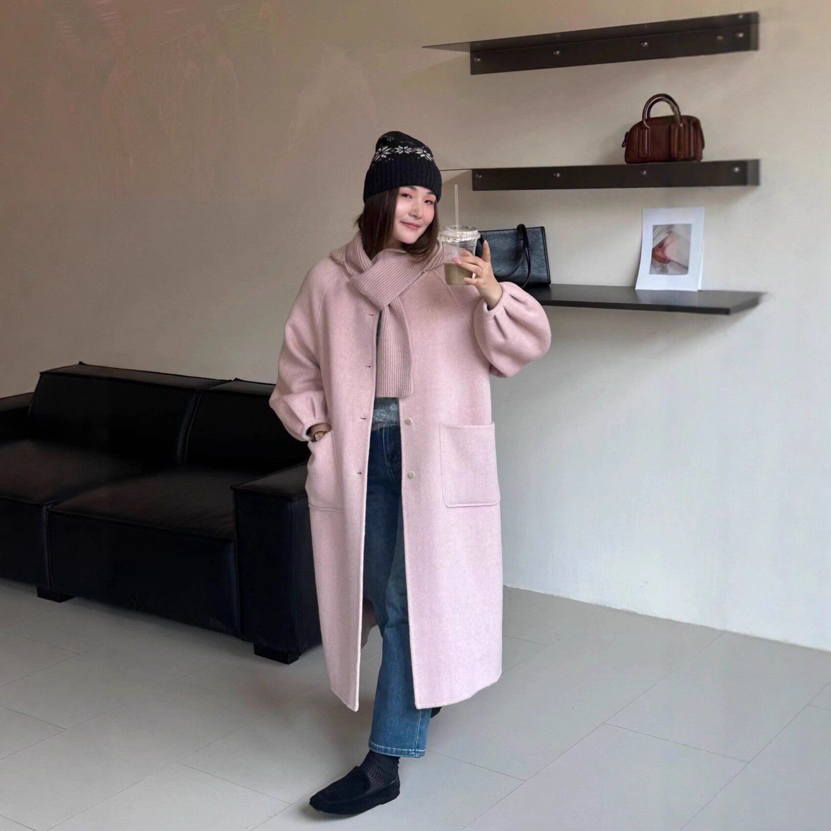 连衣围巾领双面羊毛大衣女长款宽松加厚保暖过膝羊毛毛呢外套秋冬