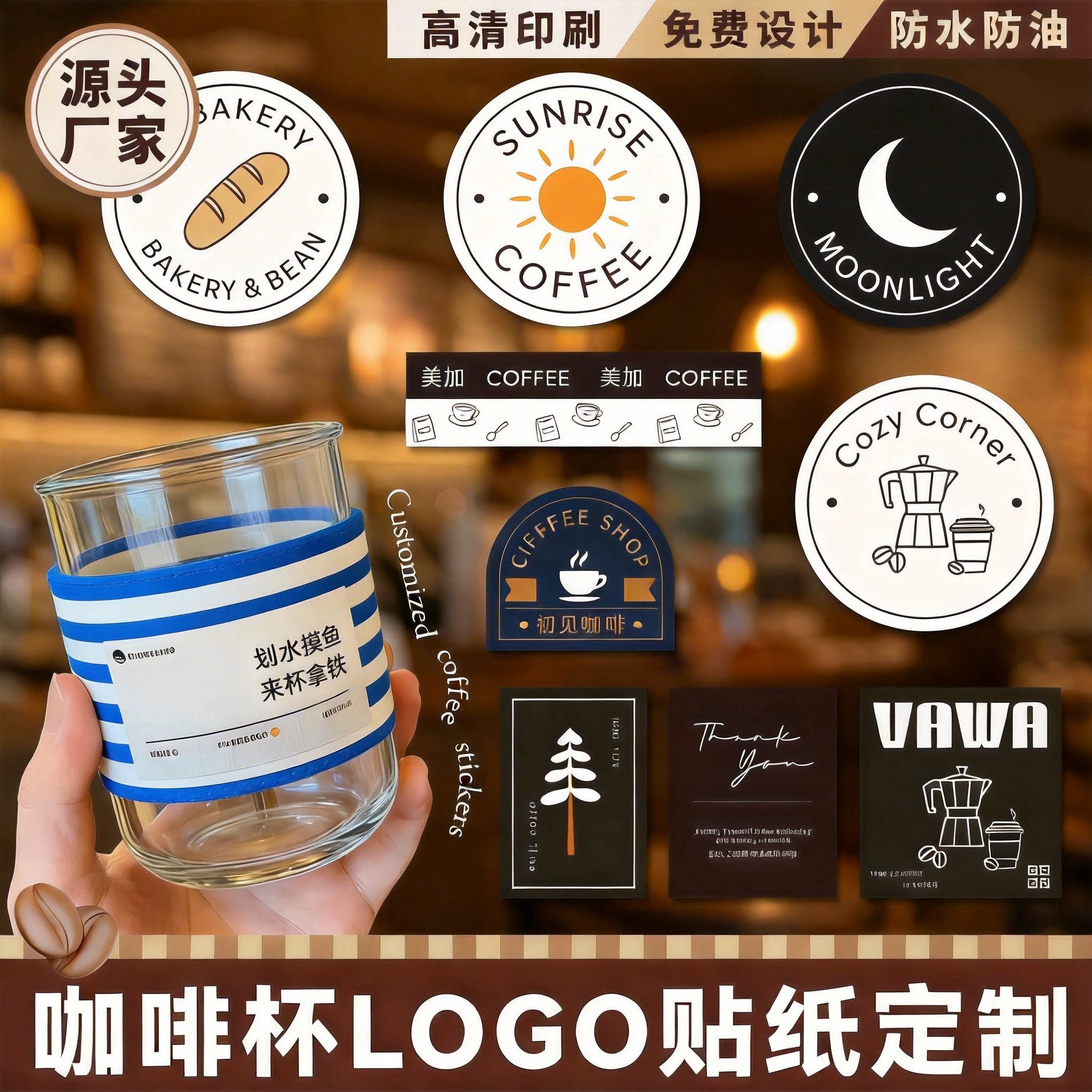 咖啡杯贴奶茶贴纸不干胶定制LOGO贴纸定制标签定制饮品贴免费设计
