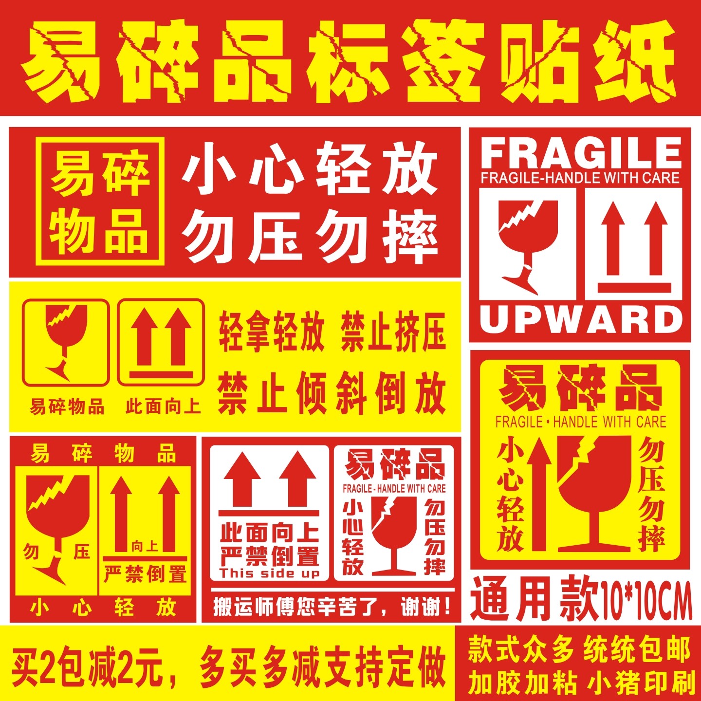 易碎标签贴纸小心物品轻放定制快递物流包装外箱150*150玻璃勿压100*100大号标贴警示语贴不干胶防摔50*80