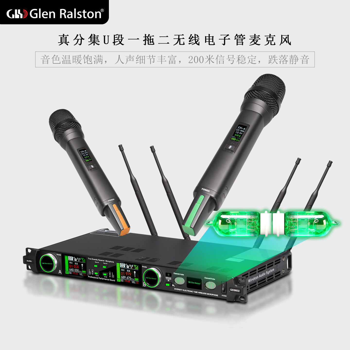 GLSD格伦士顿专业电子胆管无线麦克风话筒会议家用ktv一拖二动圈