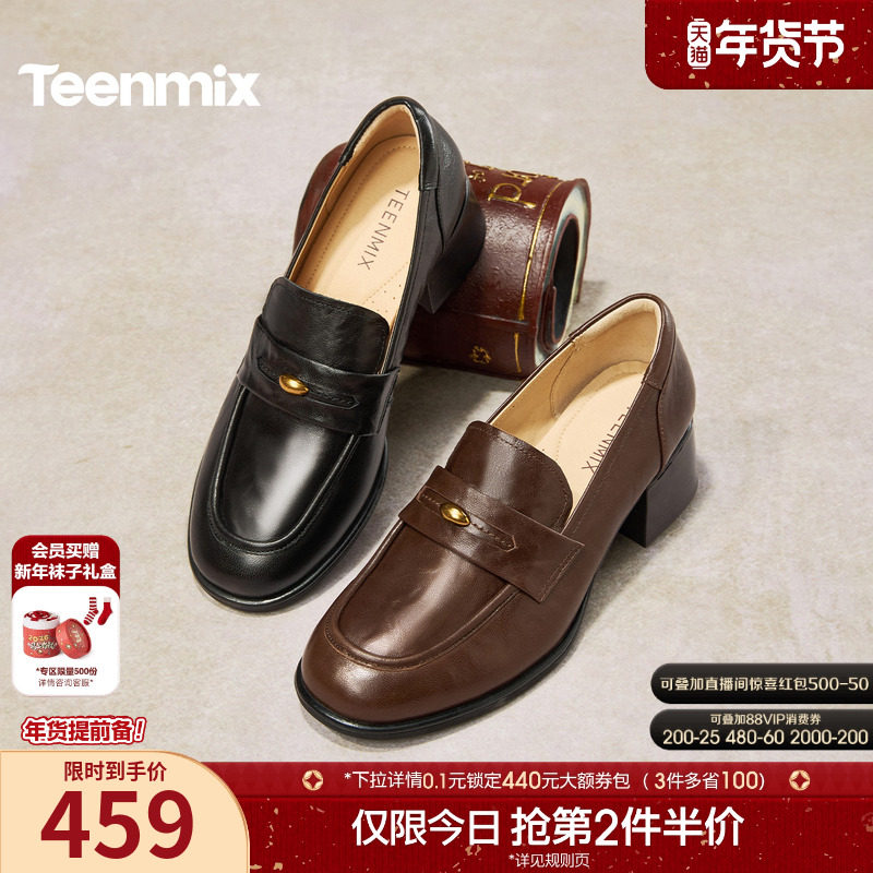 天美意粗跟厚底增高英伦乐福鞋复古单鞋女高跟小皮鞋2026春季新款