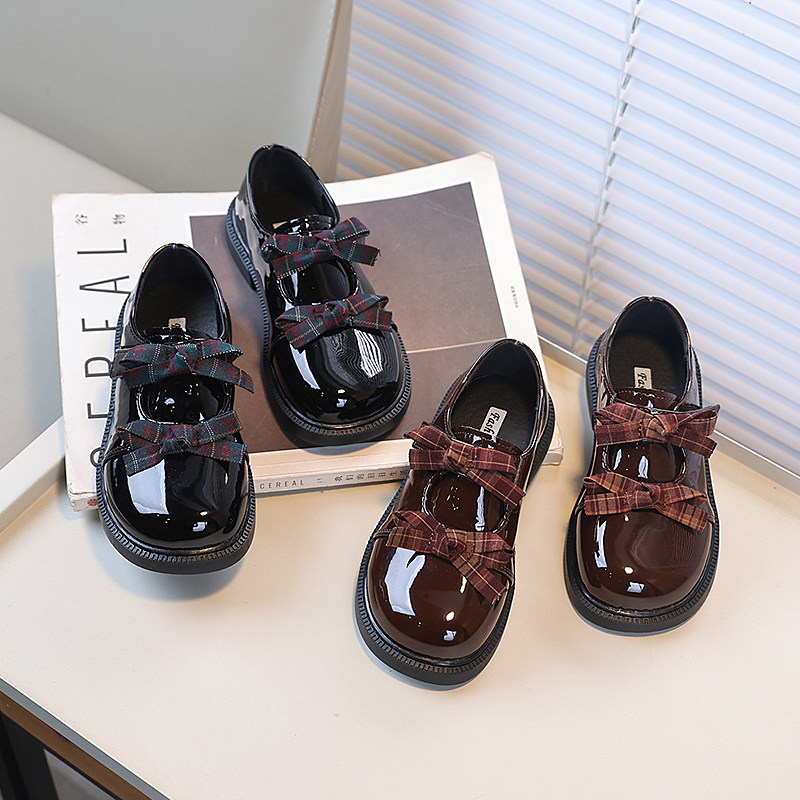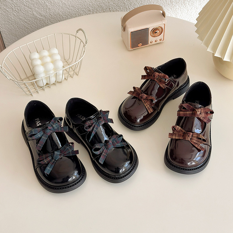 2026新款格子双蝴蝶结学院风皮鞋童鞋韩版软底百搭英伦风女童