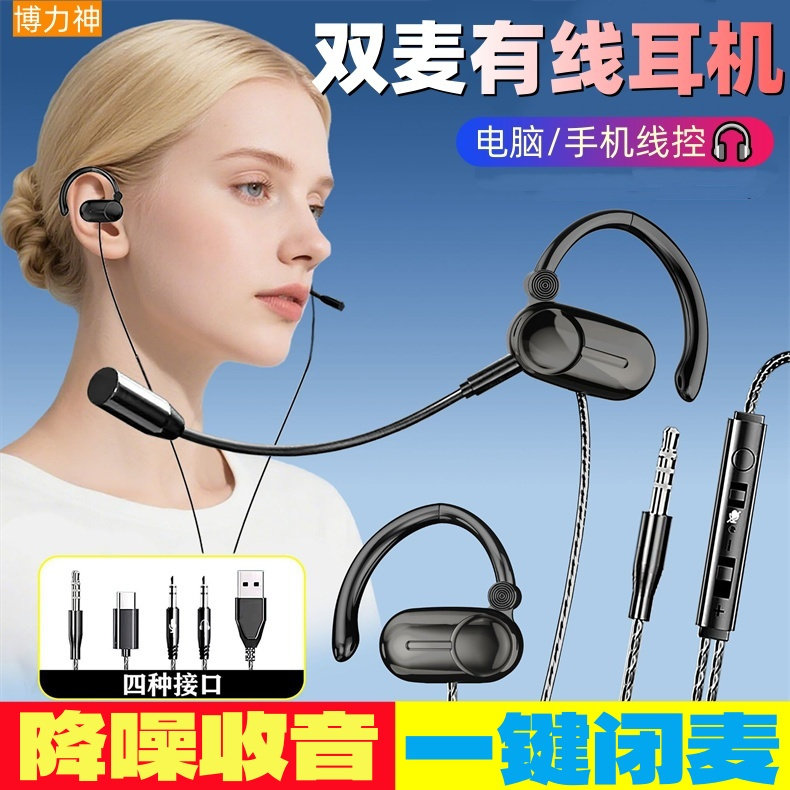 博力神双麦电竞游戏耳机电脑有线挂耳式一键闭麦降噪收音手机线控