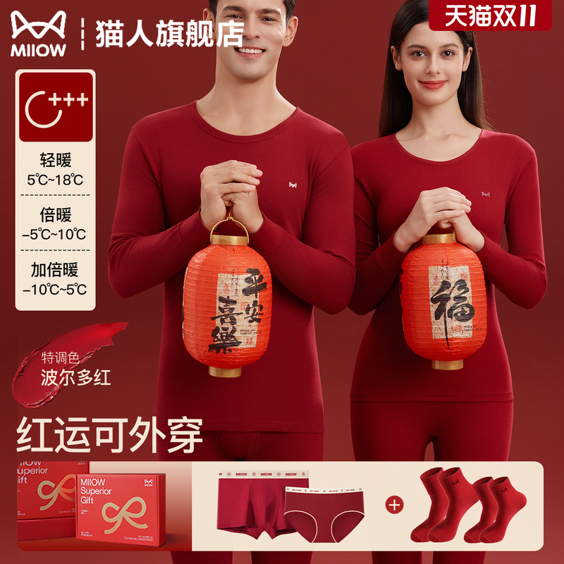 猫人本命年保暖内衣男士秋冬季结婚大红色2025蛇年秋衣秋裤套装女