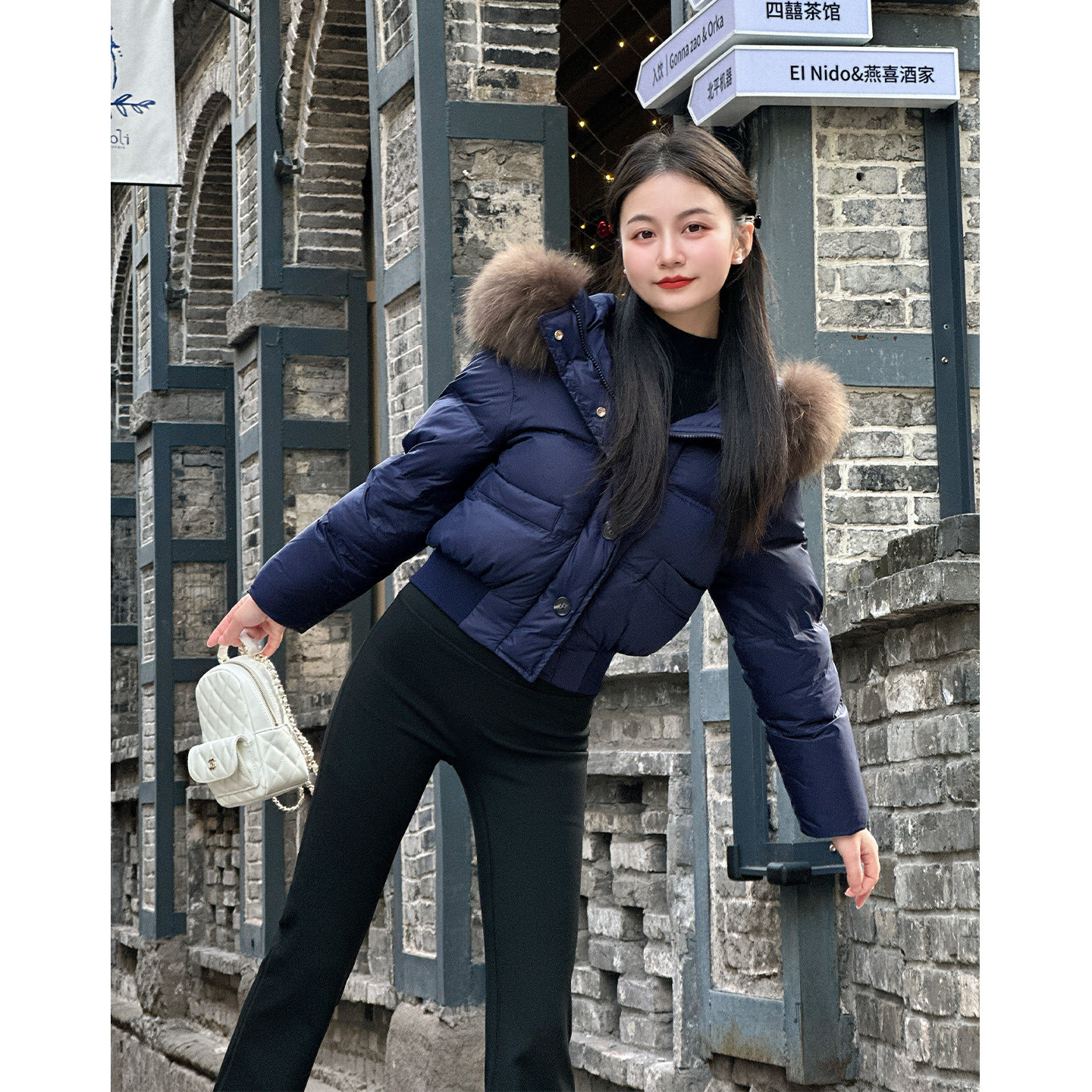 【冷冽都市】小娜椒小个子韩系保暖短款藏青羽绒服连帽毛领外套女
