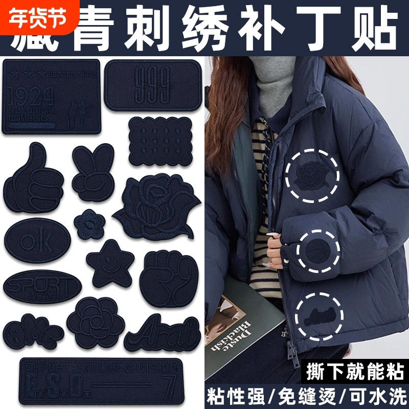 自粘免缝藏青羽绒服补丁贴补衣服贴破洞修复刺绣布贴修补布丁装饰