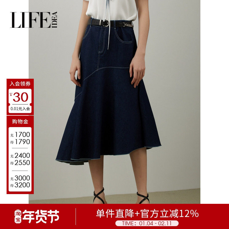 莱芙艾迪儿夏季新款高腰牛仔半裙气质优雅品牌女装荷叶边裙a字裙