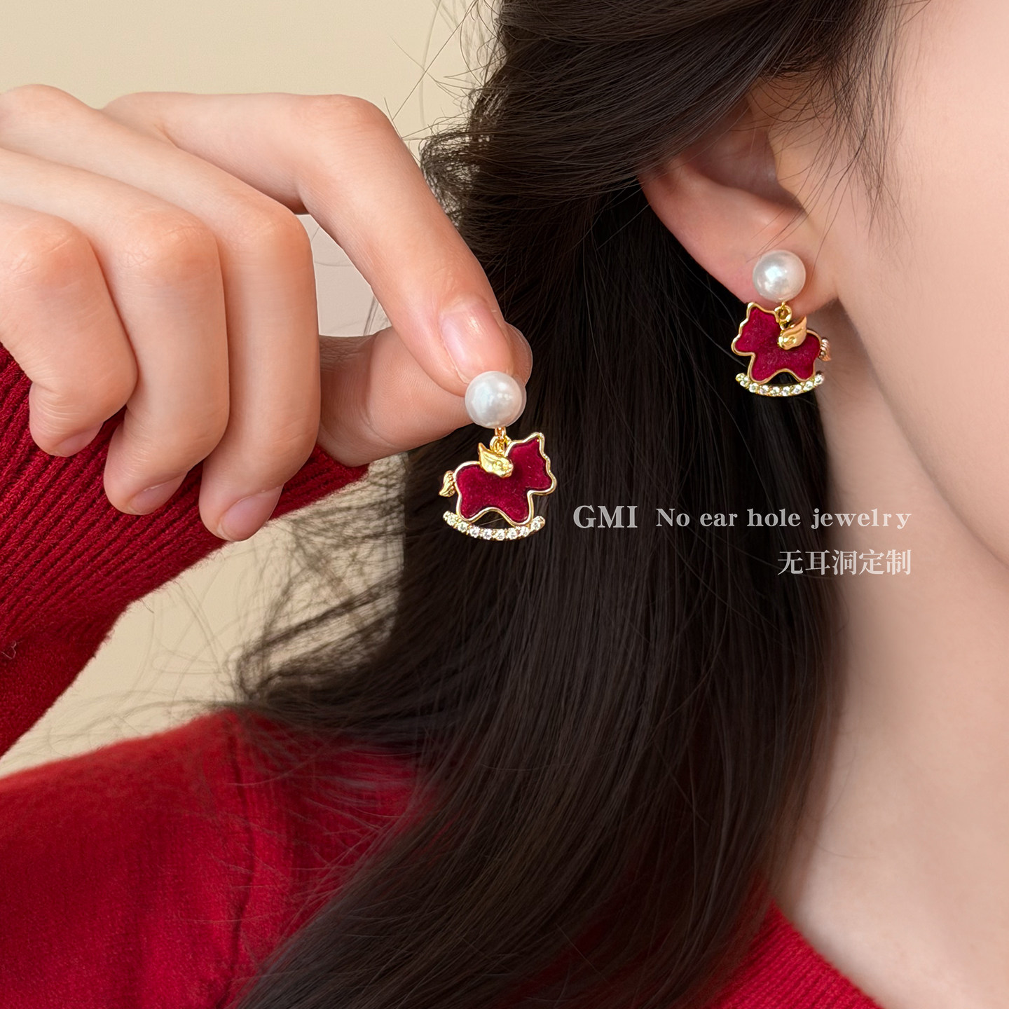 本命年红色小马珍珠无耳洞耳夹女2026新款轻奢高级感耳环新年耳饰