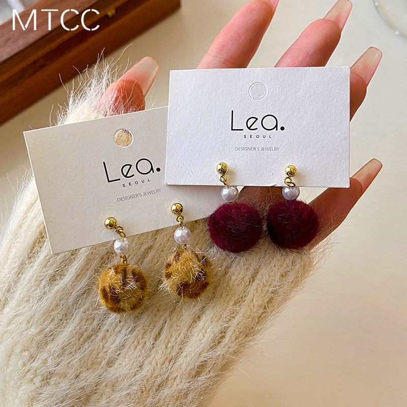 韩国气质网红豹纹毛绒耳环女毛毛纯银耳钉高级感轻奢百搭毛球耳圈