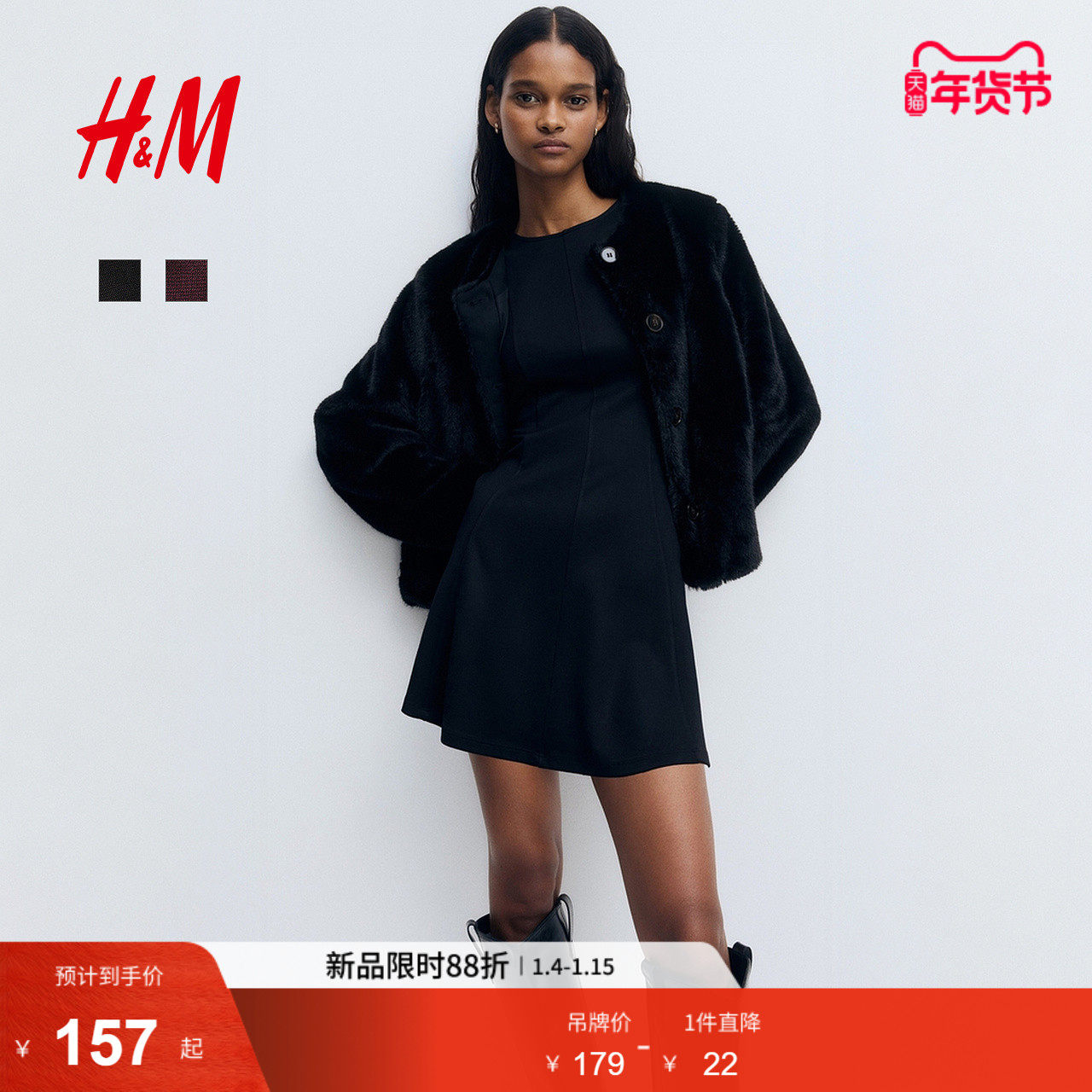 HM女装连衣裙2026春季新款红色新年罗马布喇叭裙摆短款裙1321300