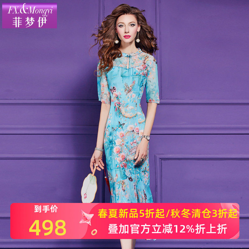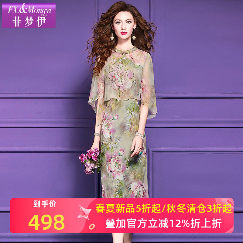 菲梦伊原创100桑蚕丝印花连衣裙女夏装高品质真丝国风钉珠旗袍裙