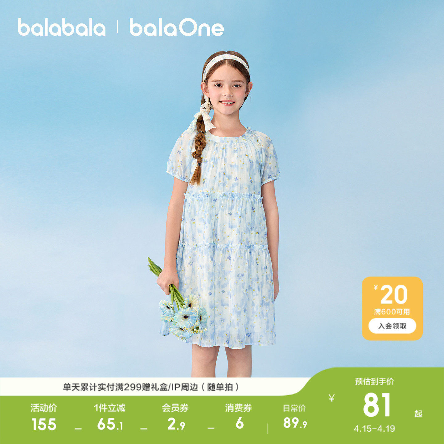 巴拉巴拉女童裙子儿童连衣裙夏装大童甜美泡泡袖A字塔裙印花时尚