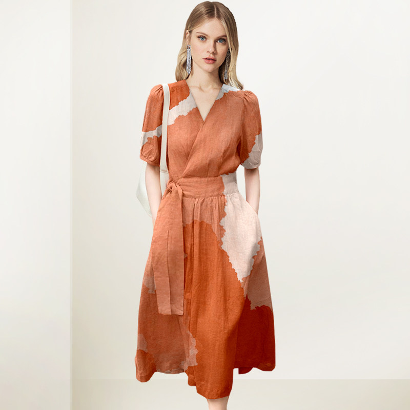 麦叙原创《橙花落岸》法式海岛度假风撞色印花花苞连衣裙挂脖长裙
