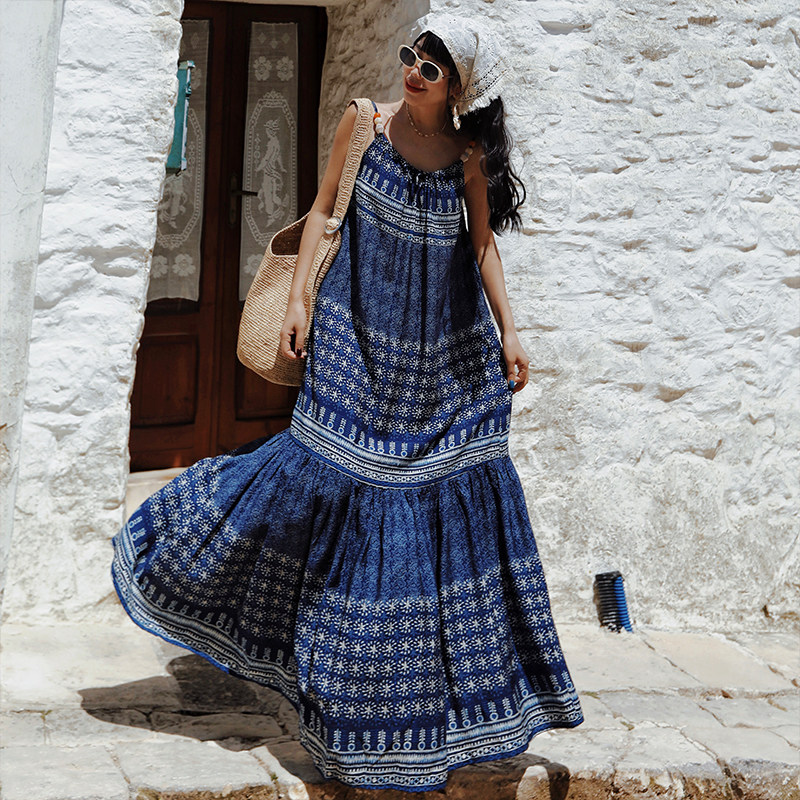 麦叙原创《蓝桉与花》法式复古度假风民族印花串珠吊带连衣裙长裙