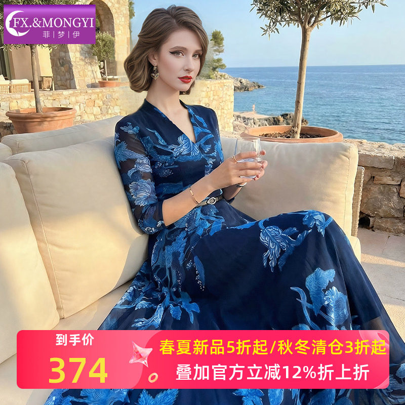 菲梦伊蓝色印花连衣裙女夏装新款轻熟优雅高端设计感收腰V领长裙