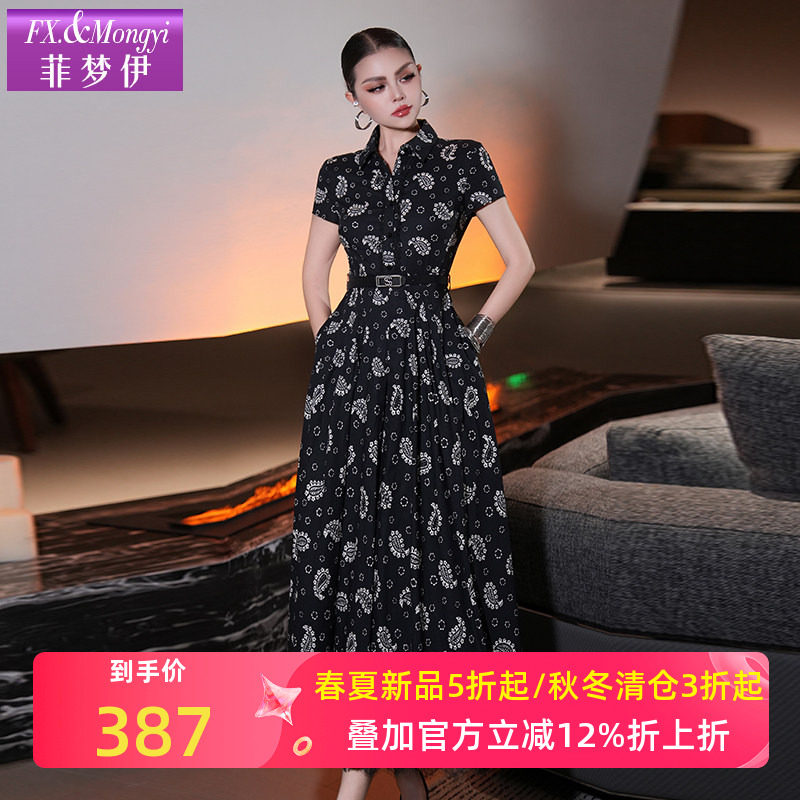 菲梦伊印花黑色衬衫连衣裙女夏装时尚减龄高级感收腰气质A字长裙