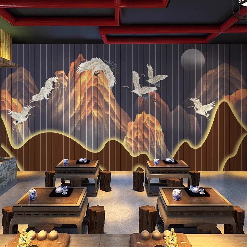 3d立体中式客厅墙纸木条格栅茶室茶馆壁画仙鹤假山电视背景墙壁画