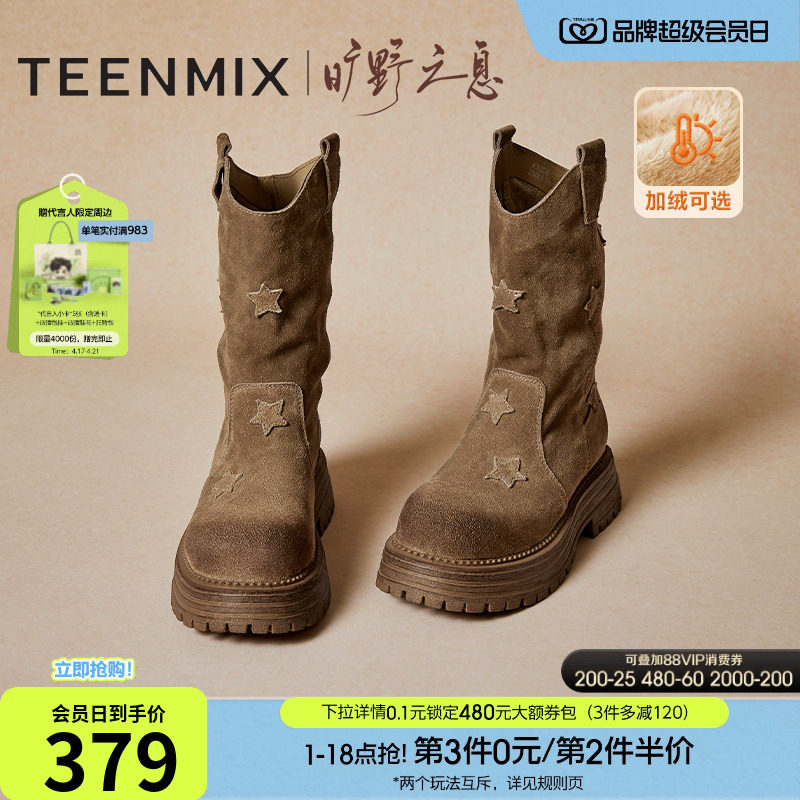天美意复古V口厚底西部靴加绒星星堆堆靴女鞋子冬新款骑士靴短靴