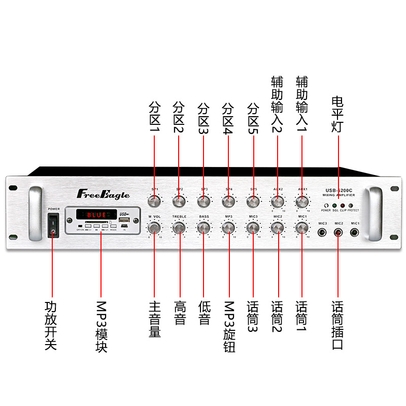 650W定压功放 带USB 多路 6分区六路独立控制音量 公共广播功放机