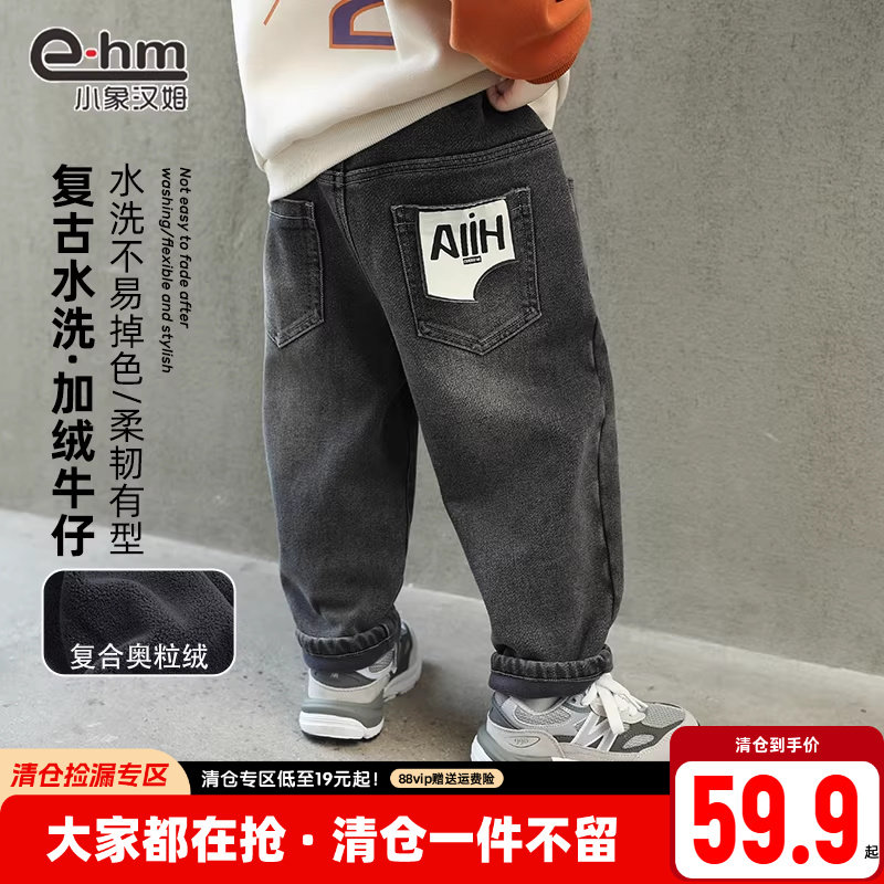 小象汉姆童装男童牛仔裤加绒冬装新款儿童一体绒裤子2026洋气宽松