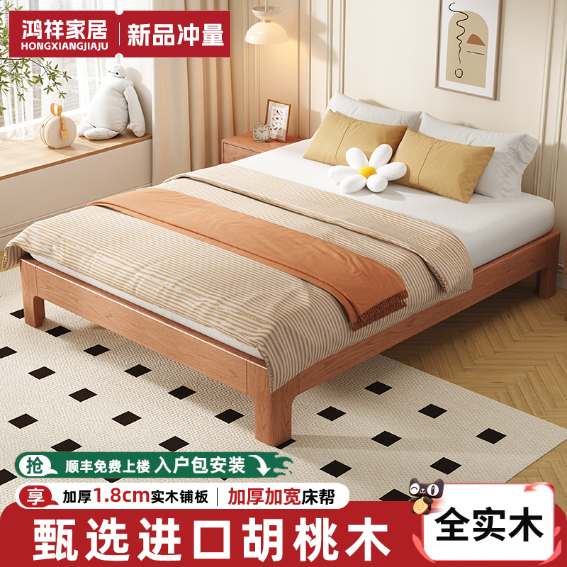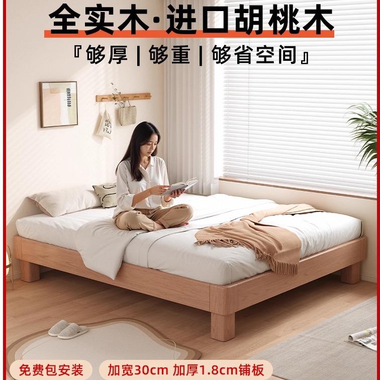 全实木床胡桃木悬浮床家用榻榻米无床头小户型出租房用单人床矮床