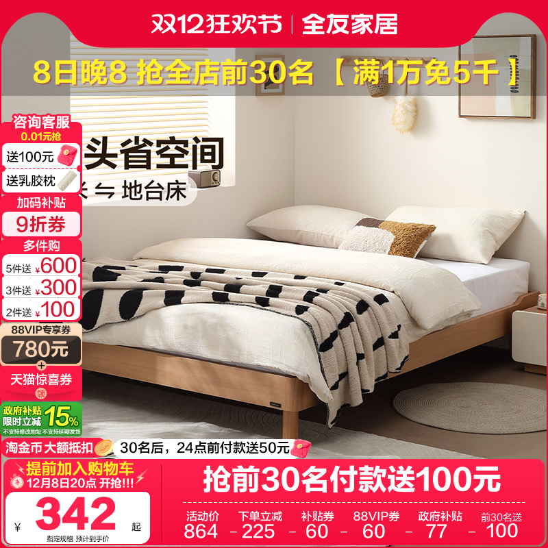 全友家居原木风无床头床榻榻米卧室地台床架新款实木脚家具单人床