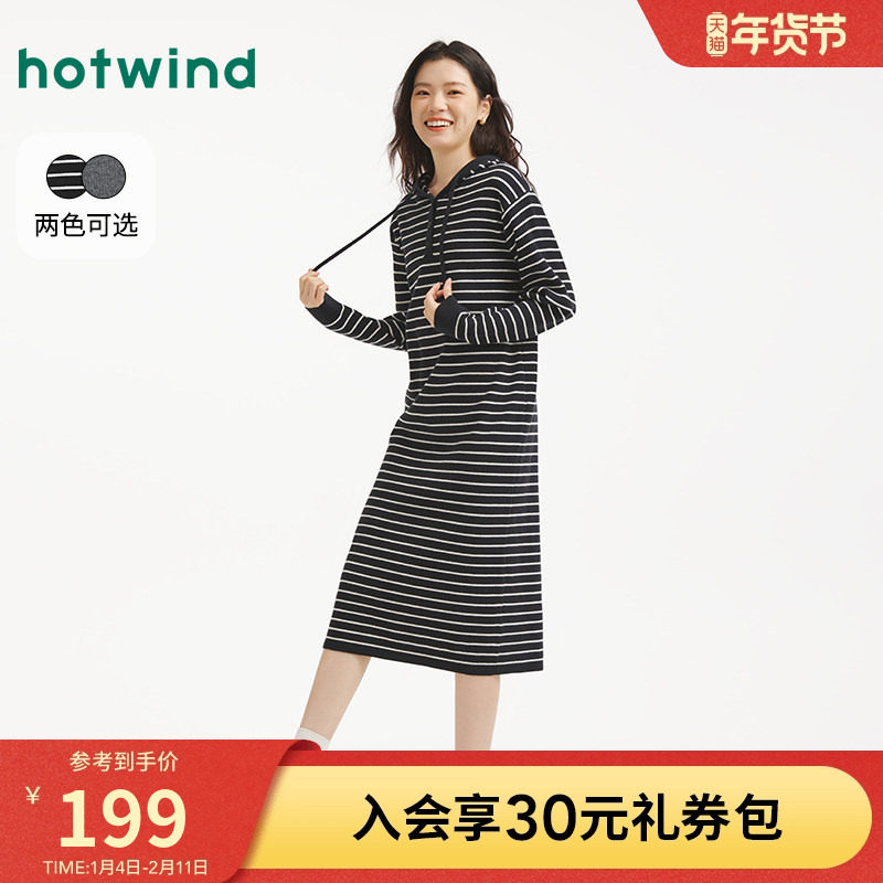 热风女士连衣裙打底衫2025年冬季新款连帽针织连衣裙宽松直筒长裙