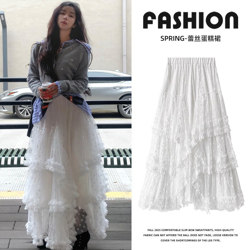白色网纱蕾丝半身裙女春季2025新款松紧高腰显瘦垂坠感蓬蓬蛋糕裙