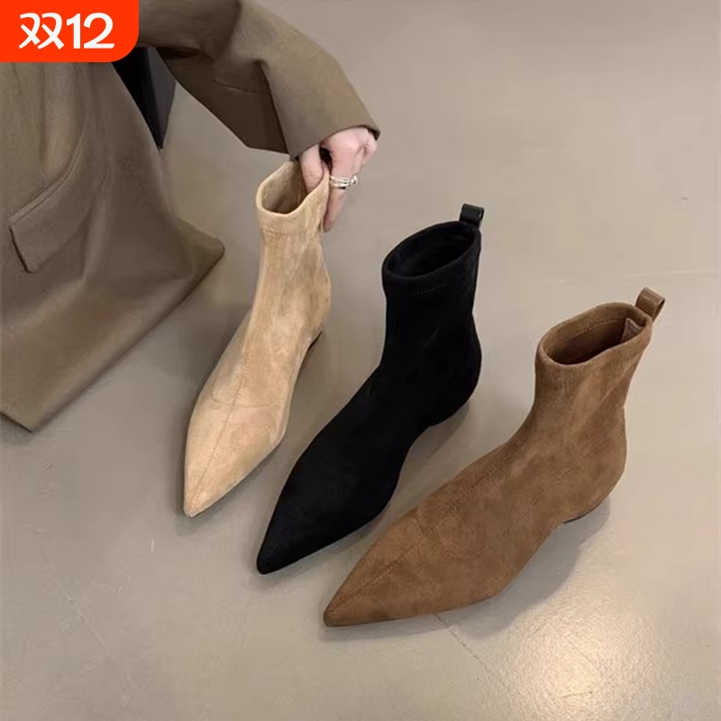 欧美2025秋冬新款简约磨砂绒面平底袜靴平跟瘦瘦靴气质尖头短靴女