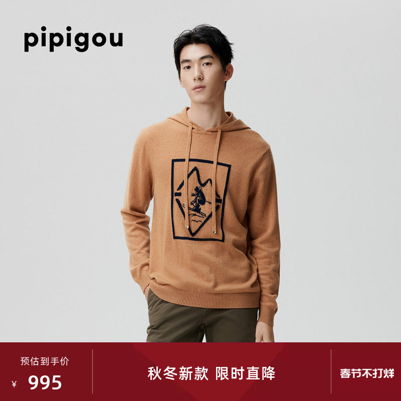皮皮狗25秋冬新款连帽领羊绒衫滑雪运动元素提花休闲落肩男士毛衣