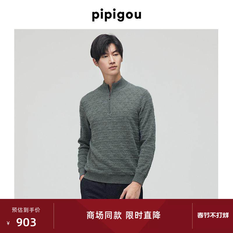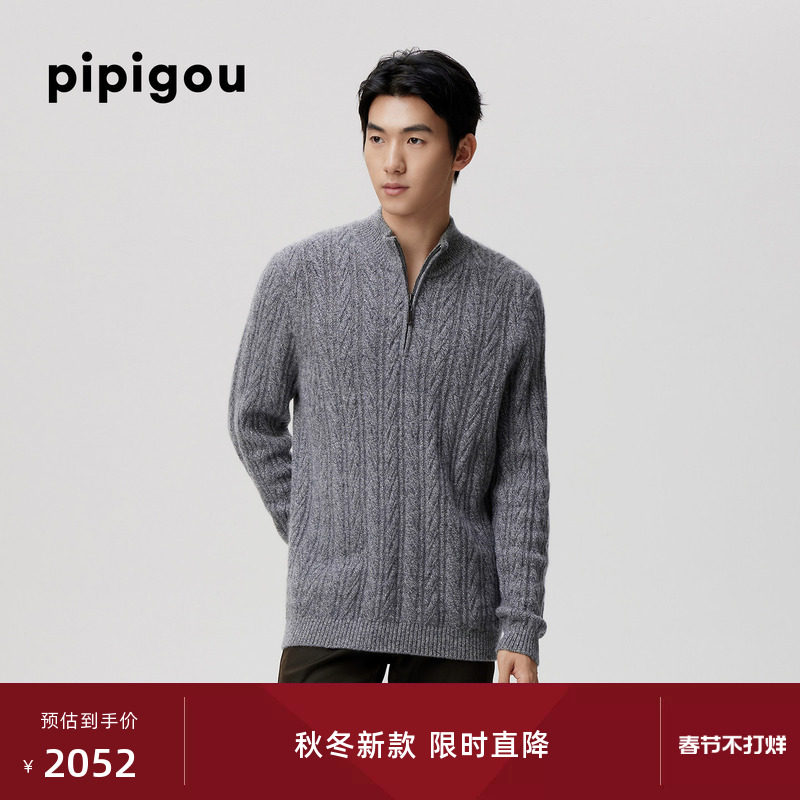 皮皮狗25秋冬新款拉链半门襟领羊绒衫绞花加厚款双股纱男士毛衣