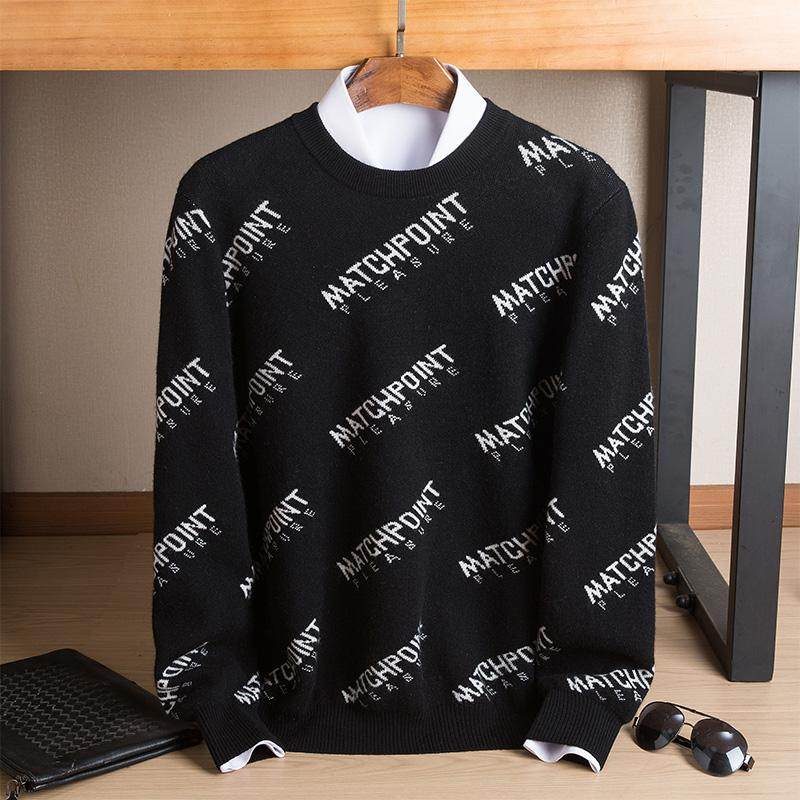 2025新款圆领加厚羊绒衫男100%纯山羊绒字母提花针织青年男士毛衣