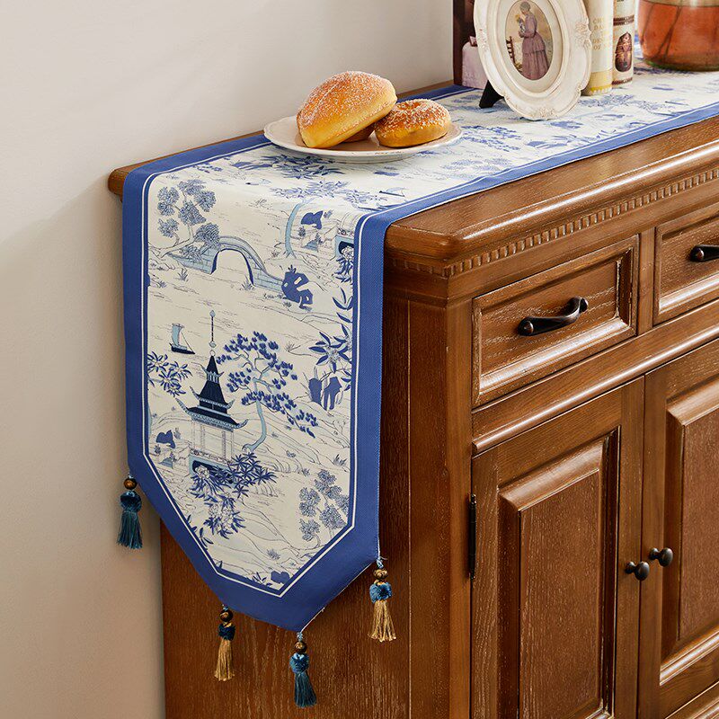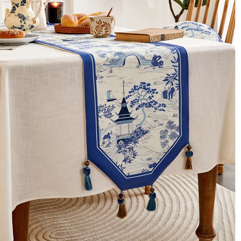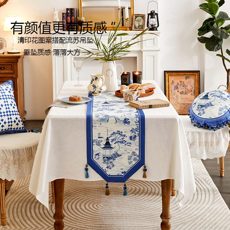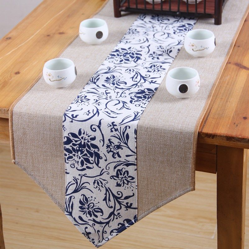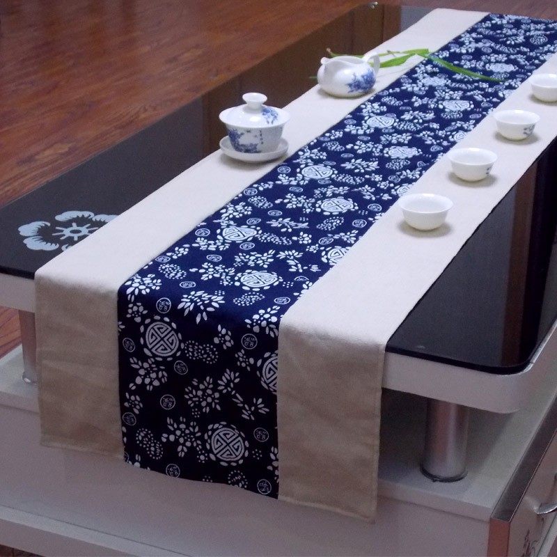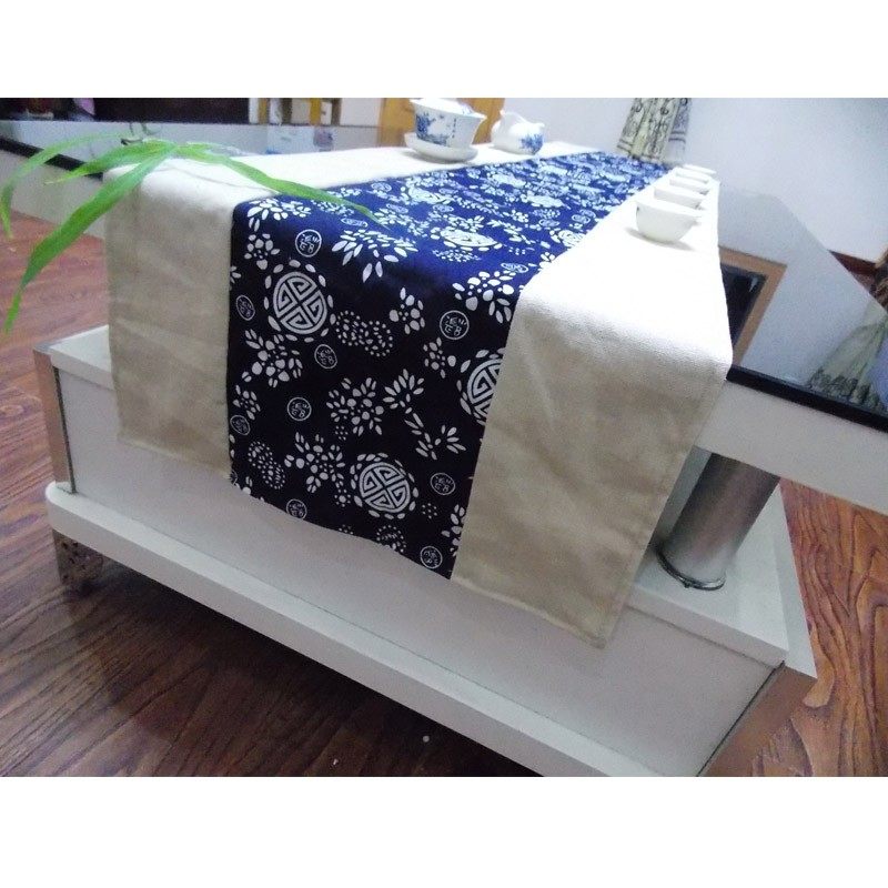 民族布艺亚麻蓝色印花桌旗 中式茶几桌旗床旗餐桌布布艺软饰台布