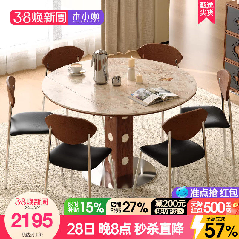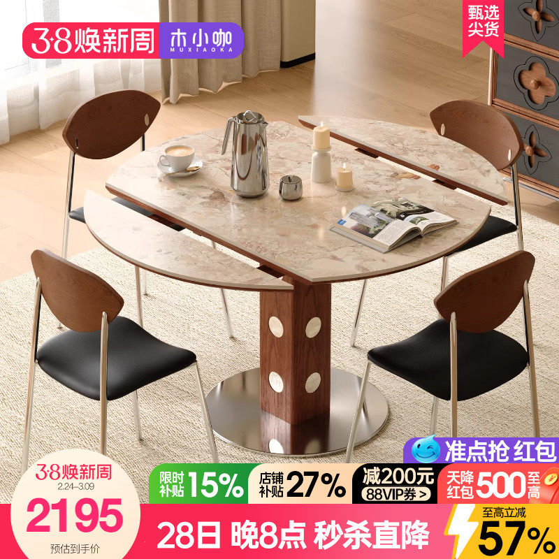 木小咖实木胡桃色洞石岩板餐桌折叠伸缩方圆两用伯格圆饭桌椅组合