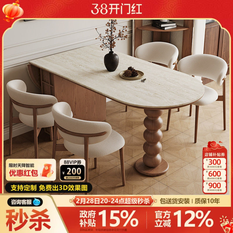 宫殿威仪洞石岩板餐桌折叠美式餐桌椅组合家用椭圆形饭桌子中古风
