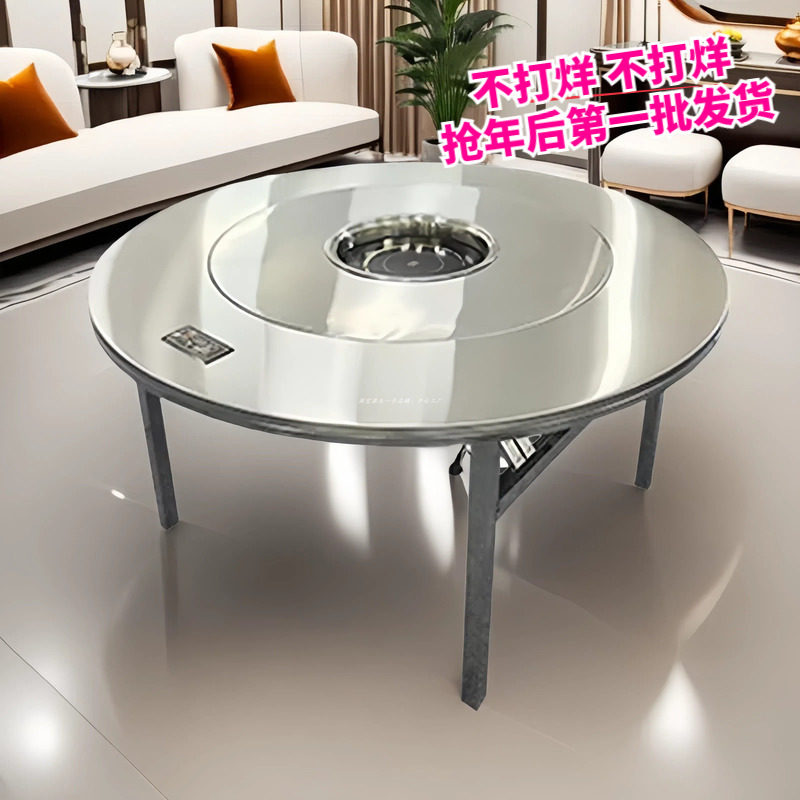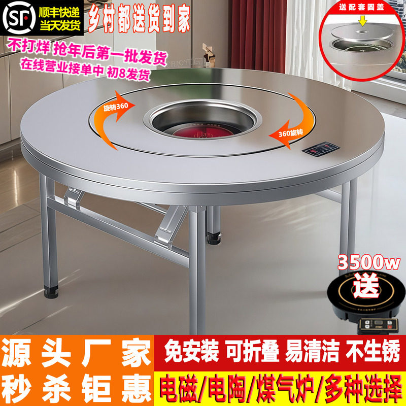 不锈钢转盘圆桌家用餐桌折叠桌子商用大饭桌下沉火锅桌电磁炉一体