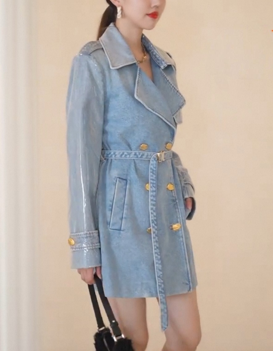 佟丽娅同款浅蓝色牛仔风衣女秋轻于鸿毛百搭中长款西装领系带外套