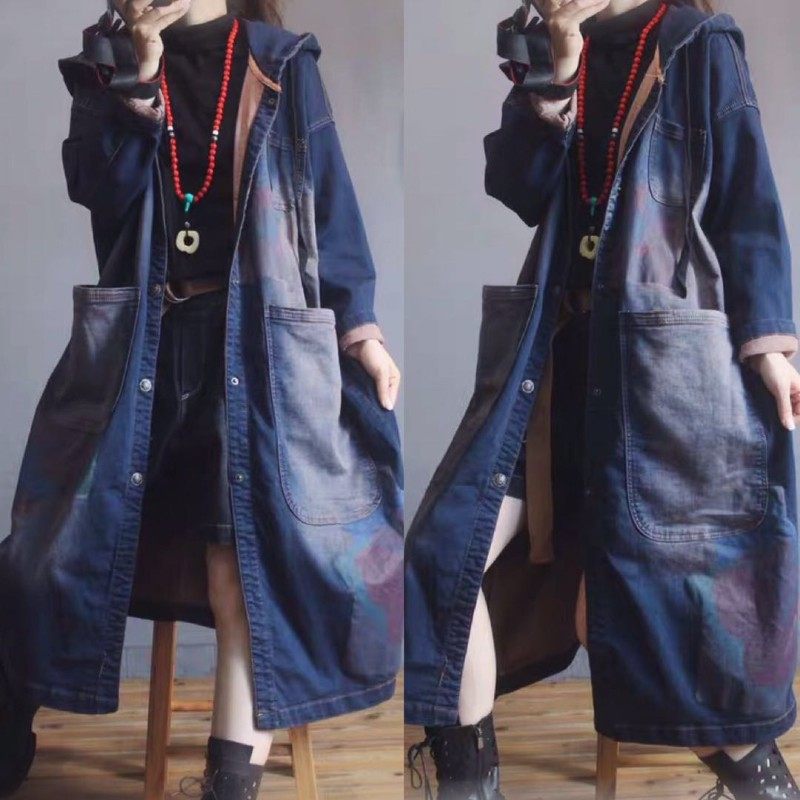 2021冬季新款个性复古印花大码牛仔风衣女开衫连帽中长款宽松外套